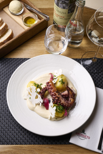 grilovaná chobotnice, krém z pečeného květáku, grenaille