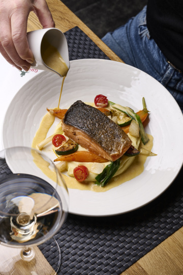 losos steak, krém z brambor, cherry rajče, cuketa, fenykl, jarní mrkvička