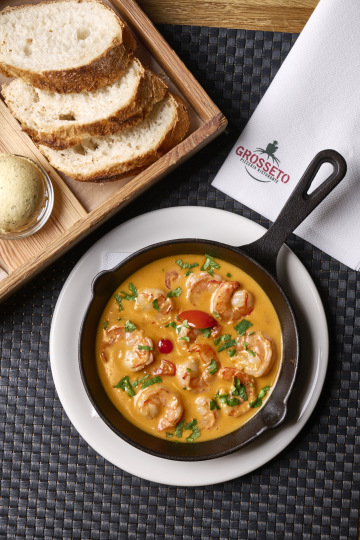 restované krevety, pikantní kari omáčka, kokosové mléko, cherry rajčátka, koriandr